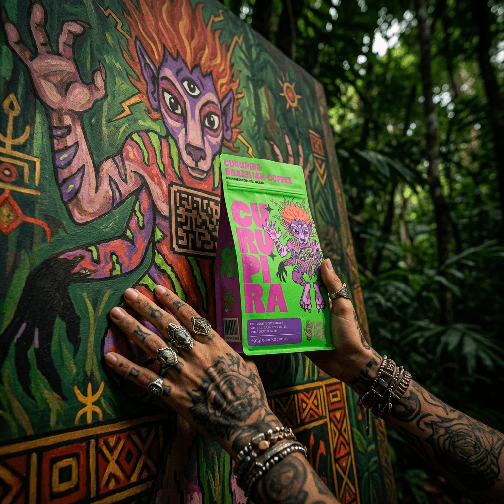 Each creature was paired with its origin country's coffee terroir. The Curupira with Brazil's dense Atlantic Forest, the Madremonte with Colombia's misty Andes, and the Orang Pendek with Sumatra's volcanic highlands. The visual system was designed to feel like it had been pulled from a field notebook: raw, mythic, alive.
