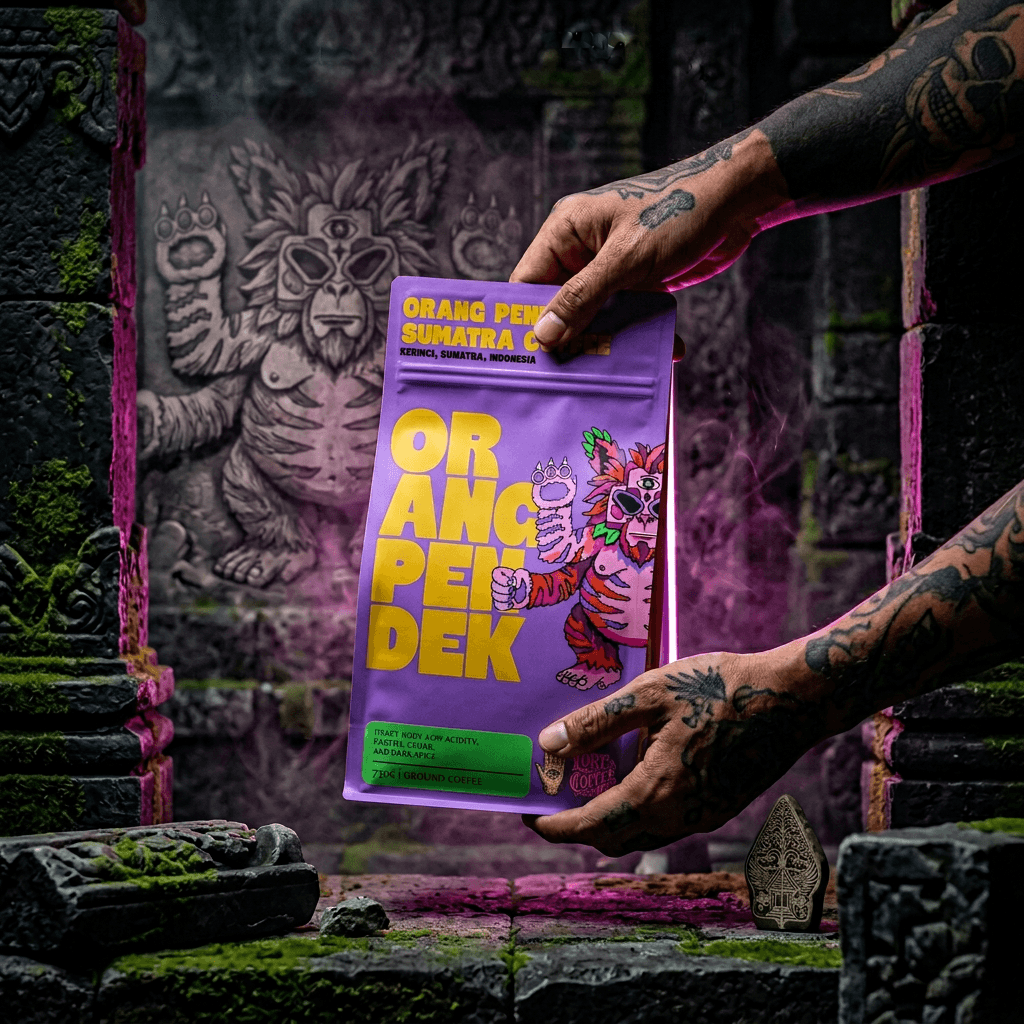 Creature design came first: each omen had to feel rooted in its culture, yet striking enough to anchor a retail product. Illustration style, color theory, and typography were developed in parallel, with Pantone® Neon palettes acting as a unifying thread across the three SKUs. Every design decision was made to create shelf disruption without sacrificing coherence. Packaging became the primary canvas. The three bags, Curupira (Brazil), Madremonte (Colombia), and Orang Pendek (Indonesia), each carry their omen's full mythology: origin region, roast character, and a visual language that rewards close inspection. The Three Omens are designed to be collected, not just consumed.