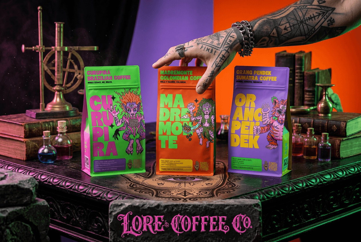 The objective was to build Lore Coffee Co. from the ground up: a brand rooted in the mythological lore of the world's great coffee origins. Brazil, Colombia, and Indonesia each gave life to one product in The Three Omens collection. The result needed to feel ritualistic, collectible, and undeniably different, speaking directly to young, alternative coffee drinkers who see their cup as a statement.